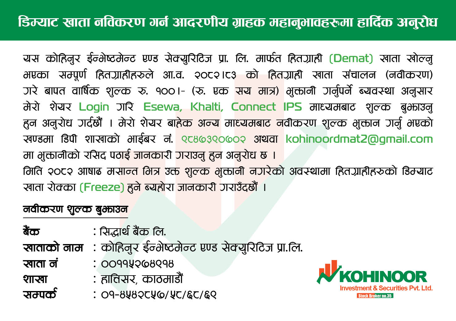 Kohinoor Investment and Securities Pvt. Ltd. was established by a team of professionals. It was registered in 2063/64, under Nepal government ministry of industry with office of company register. The operation was started after obtaining the license from SEBON.